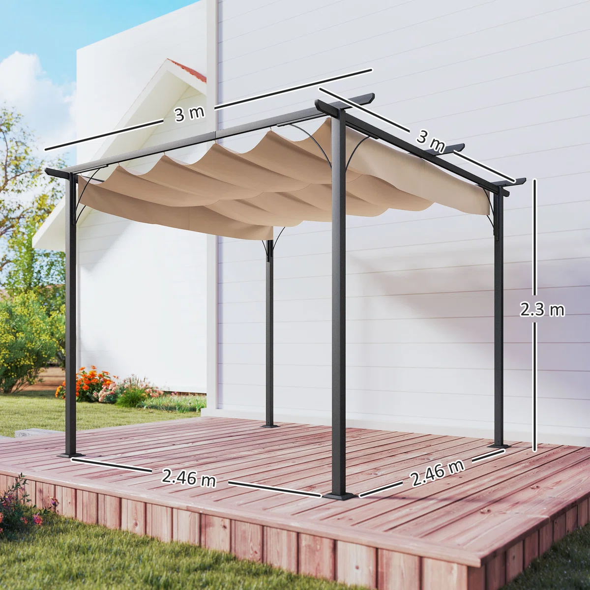 This 3m x 3m Metal Pergola offers a durable and stylish outdoor structure, featuring a powder-coated metal frame that provides shade and shelter while enhancing your garden, patio, or terrace.