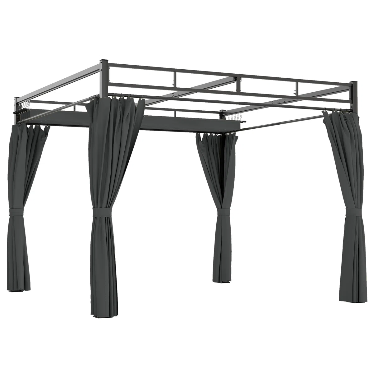This modern metal pergola features a sleek powder-coated frame with durable curtains, providing stylish shade and privacy for outdoor dining, relaxation, or entertaining on patios and gardens.